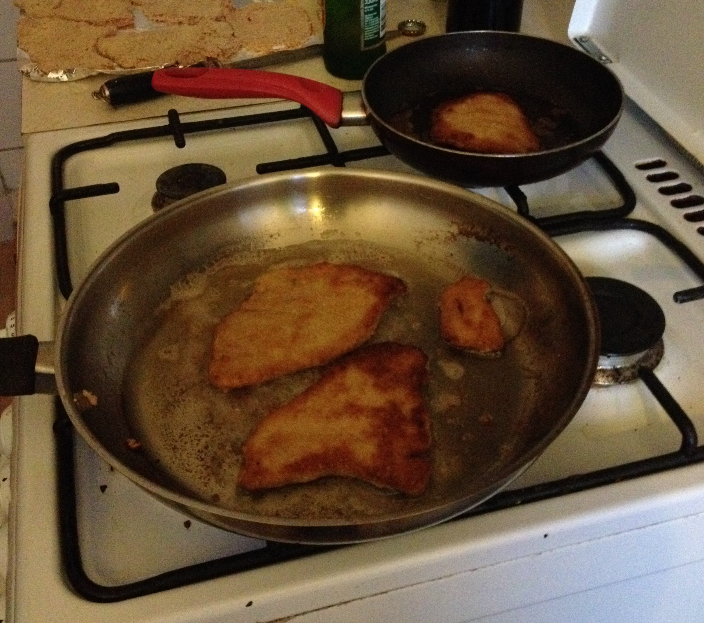 Step 6: FRY THOSE SUCKERS! Carefully (tongs can be quite useful here) place your bashed and breaded meat into the fryer and cook on both sides until golden brown.