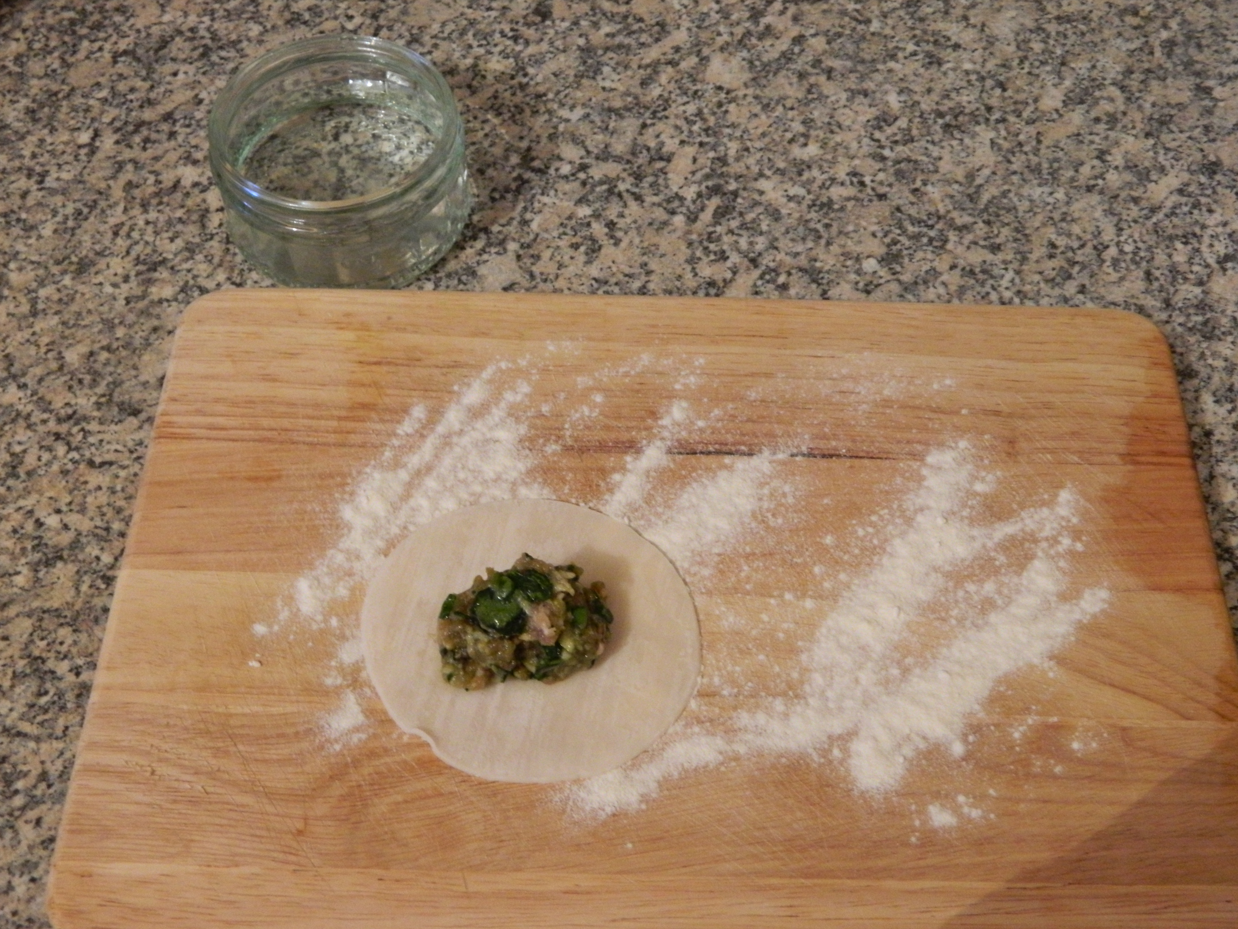 5. Sprinkle some flour on a flat surface and lay down your first dumpling pastry.  Add a tsp of filling to the centre.  The trick is not to overfill or it oozes out like a kind of snotty green mush when you try to seal the dumpling.DSCN0652