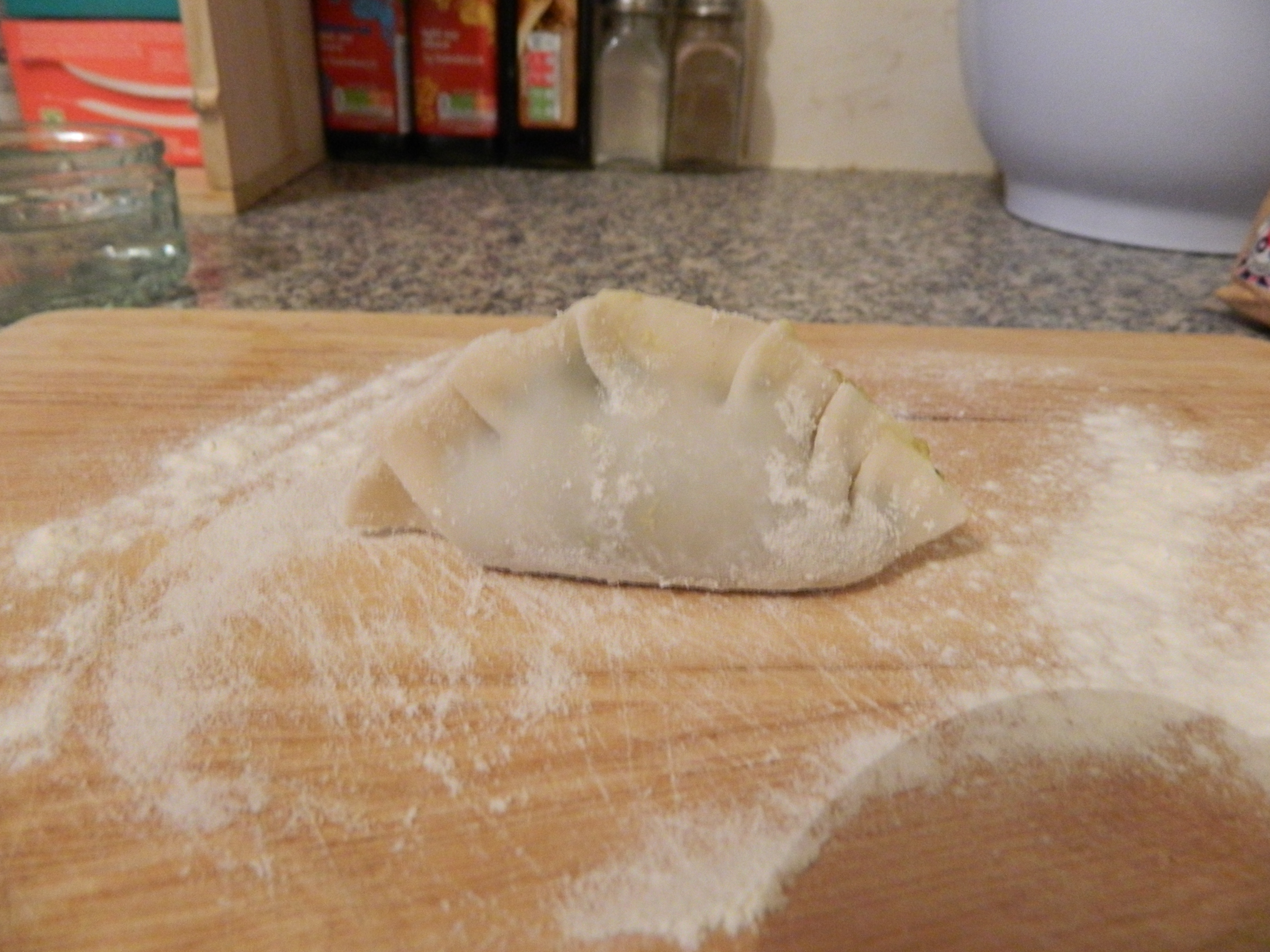 7. To seal (everyone does this slightly differently – as long as you achieve a kind of pleat you’ve done well young grasshopper) fold the pastry in half and pinch together around the edge. Starting at one end pinch the edges in both hands between your forefinger and thumb, fold the edge in one hand on top of the other and then pinch that down.DSCN0655