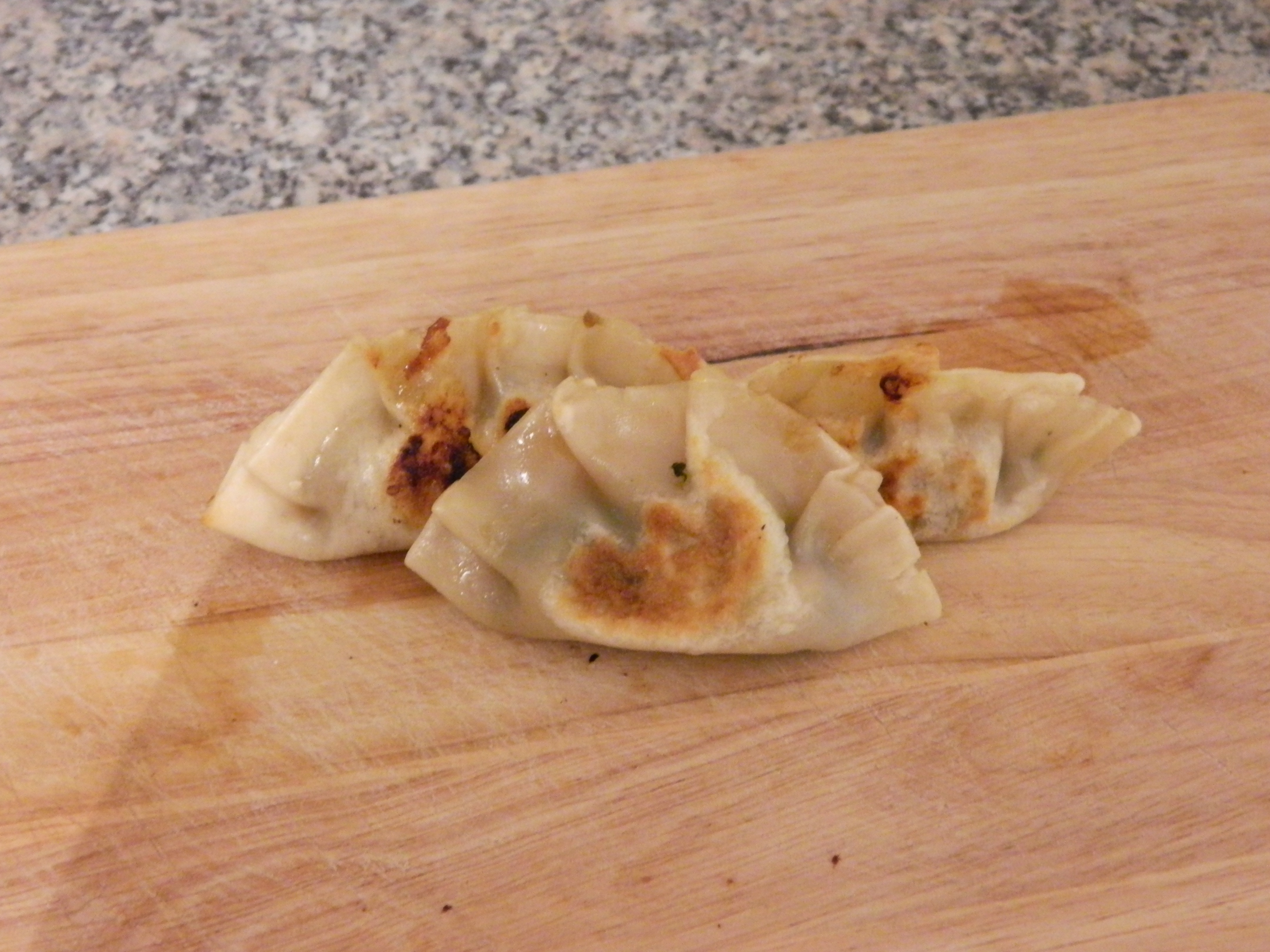 9. Liberally coat your pan with olive oil and heat. Place the dumplings in on their side and fry each side until golden brown – roughly 2 mins on each side.DSCN0658